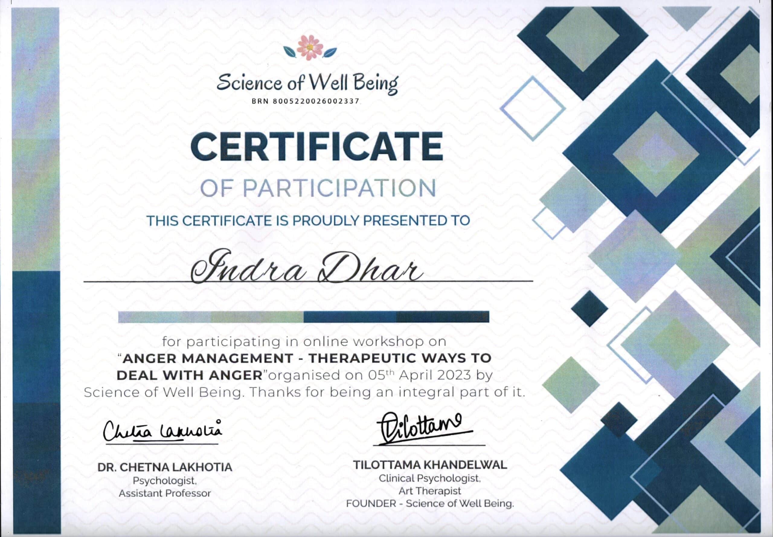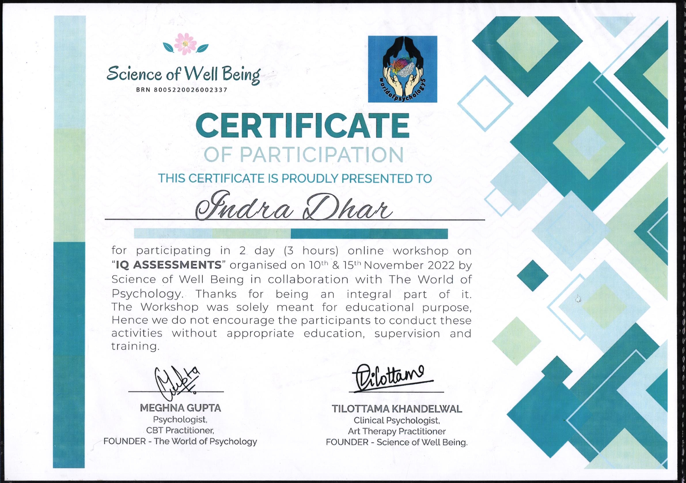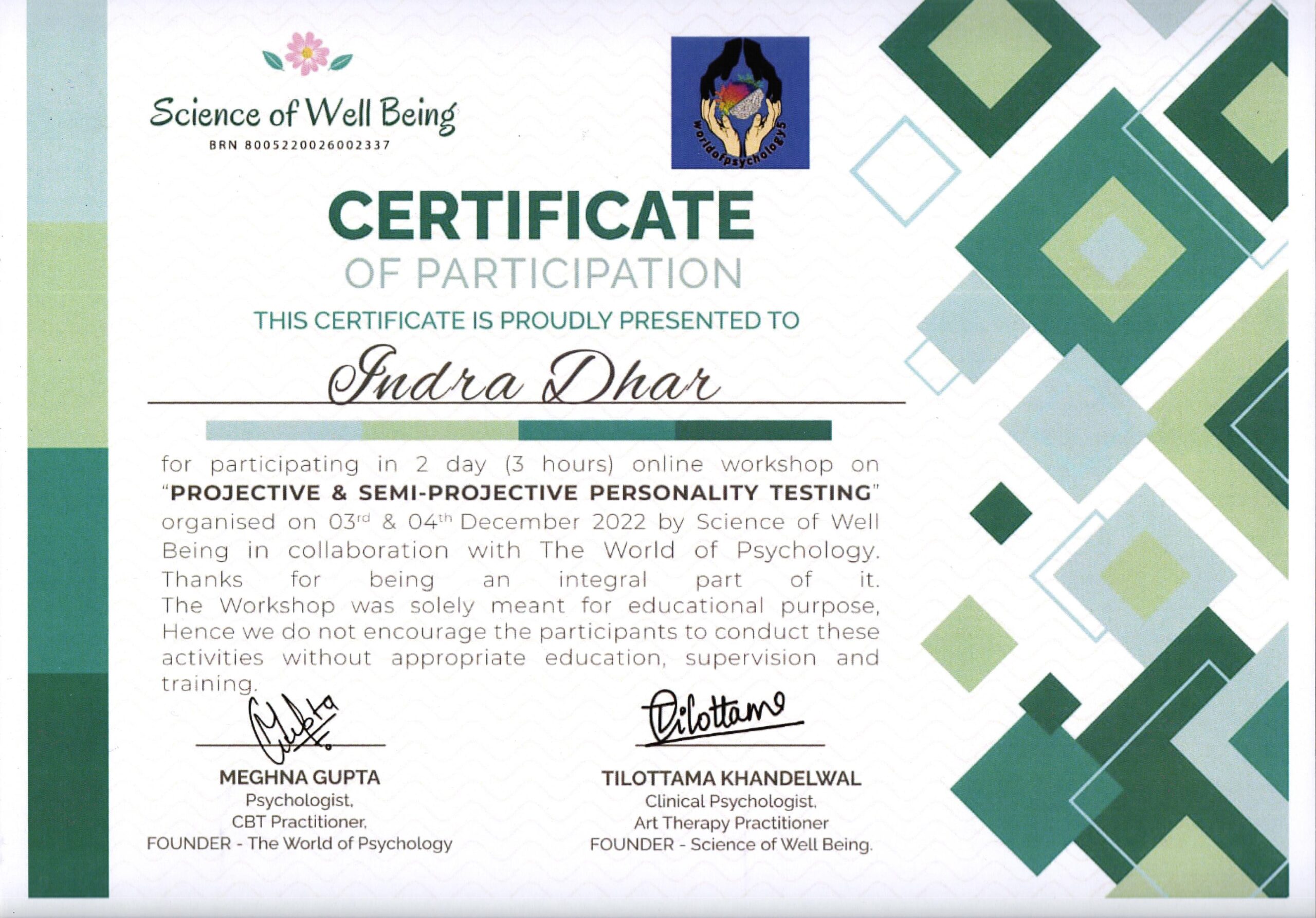 By Science of Well Being- Completion of Projective & Semi- Projective Personality Testing Workshop