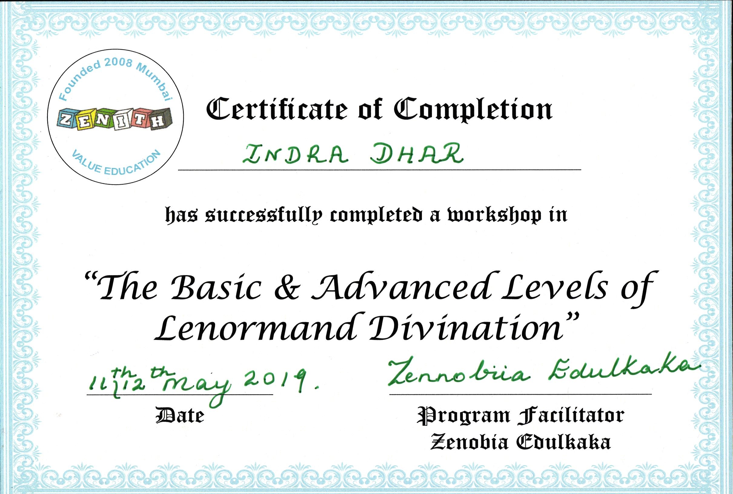By Zenith Value Education- for Completion of Advanced Course on Lenormand Divinations